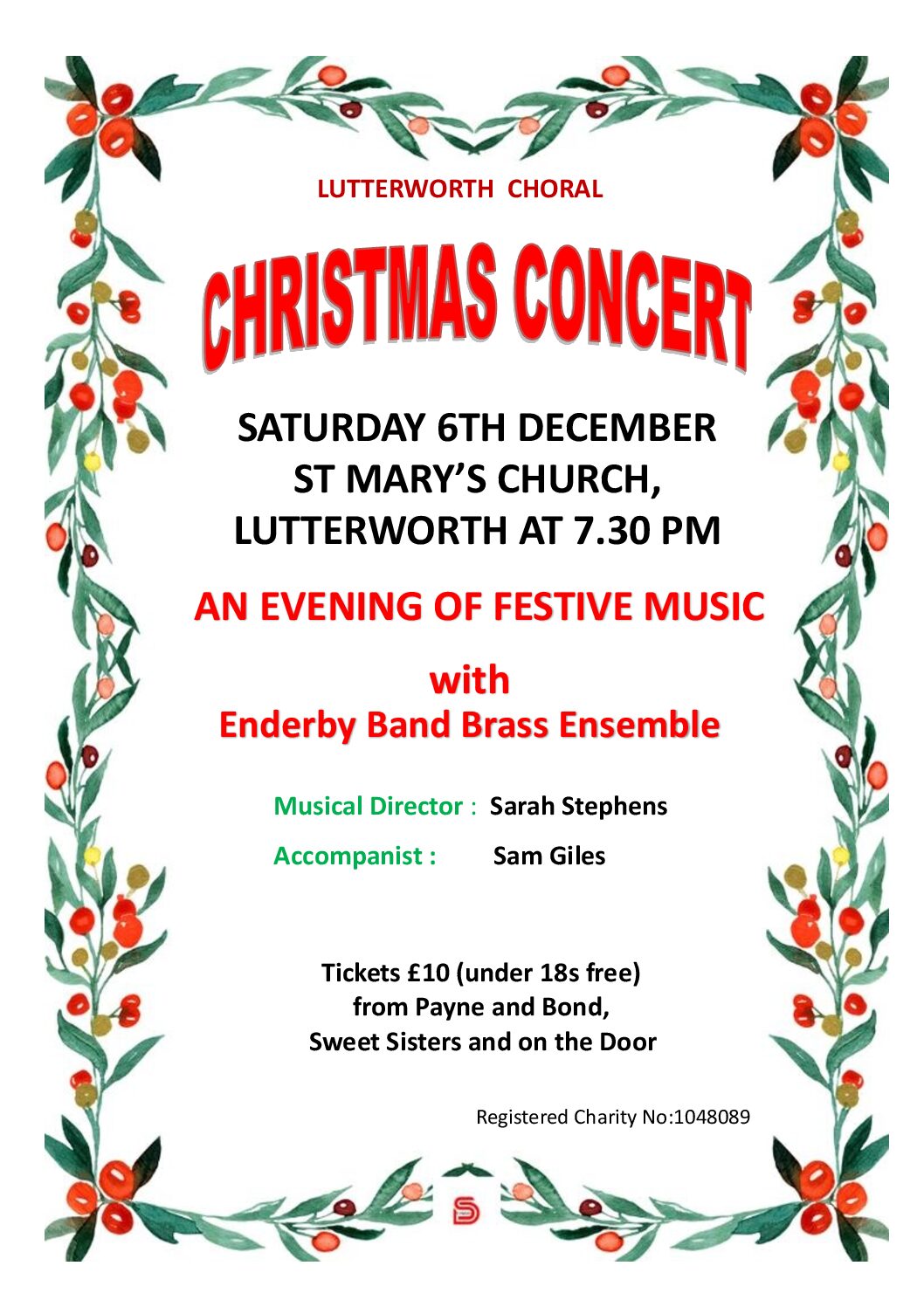 We look forward to welcoming you to another evening of festive classics, accompanied by the wonderful Enderby Brass Ensemble. There will be a collection in aid of Leicestershire and Rutland Blood Bikes, Lutterworth Town Mayor’s chosen charity. As usual, there will be a (cash only) bar. Sadly, this will be our final concert with our much loved Music Director Sarah Stephens!